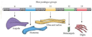 Hox 基因特化前肢特定骨骼的假设(Marcus Davis提出):Hox-9特化肩胛骨,Hox-10特化肱骨,Hox-11特化尺骨跟桡骨,Hox-12特化掌骨,Hox-13特化指骨。