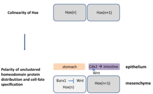 Hox-Wnt-Cdx2信号途径决定小肠上皮的分化方向。与表达不同Hox基因的骨骼间会产生关节类似,在间充质和上皮相互作用的过程中,表达不同Hox基因的间充质细胞会使与之结合的上皮细胞走向不同的分化命运。