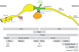 内胚层发育初期的关键转录因子。可以简单的这样理解:Hox基因簇的多米诺式表达,即Hox1-13延A-P(Anterior-Posterior)轴依次表达,发生在间充质细胞中,而非基因簇同源域蛋白(Cdx,Pdx1,Nkx2.1,Hhex1/Hex1),及其他转录因子(Sox2,Tbx1)的特异表达,发生在上皮细胞中,它们的表达使基因调控网络(gene regulatory network)走向不同的分支(subcircuit),使细胞获得不同的发育方向,而与上皮细胞结合的间充质细胞会维持Hox基因的表达模式,转变成成纤维细胞或基质细胞。