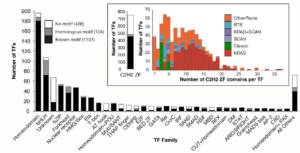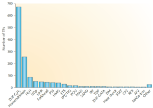 人的所有转录因子按DNA-binding domain的分类。同源域蛋白是仅次于ZNF-C2H2的第二多的转录因子,在发育初期起重要作用的转录因子(大部分是pioneer transcription factor)还包括:FOX(含Forkhead结构域),SOX(含High Mobility Group, HMG结构域),TBX(含T-box结构域),等。