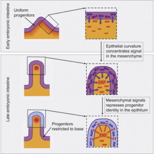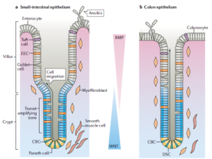 在小肠和结肠的发育中,间充质和上皮的相互作用使Wnt和BMP形成的浓度梯度,并使上皮组织中的干细胞定位于地窖(Crypt)的底部。小肠的上皮是突起的,形成绒毛(Villus),结肠的上皮是光滑的。