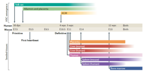 最初的造血干细胞(the primitive wave)产生于卵黄囊(Yolk sac)。接下来的胚胎发育中,最初的造血干细胞被产生于AGM(aorta-gonad-mesonephros)的最终的造血干细胞(the definitive wave)替换,胎盘,肝脏,胸腺,脾和骨髓是最终的造血干细胞依次归巢的器官,出生前,造血干细胞最后归巢于骨髓。