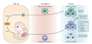 成体组织中的组织驻留巨噬细胞(Tissue-resident macrophages)具有增殖的能力,其中中枢神经中的小胶质细胞(microglia)来源于胚胎发育初期的卵黄囊(Yolk sac);肝脏中的 Kupffer cells,皮肤中的Langerhans cells,脾脏中的splenic macrophages,肺中的alveolar macrophages来源于胚胎发育中肝脏单核细胞(Fetal liver monocyte);而骨骼中的破骨细胞(osteoclasts)来源于成体骨髓中的造血干细胞。