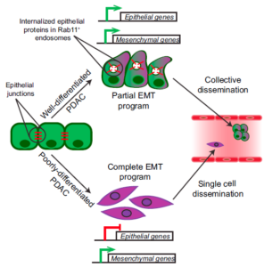 低分化的胰腺癌pancreatic ductal adenocarcinoma(PDAC)通过完全上皮间质转化,以单细胞形式迁移;高分化胰腺癌通过部分上皮间质转化,以细胞簇的形式迁移。