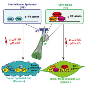 在毛发区域产生的鳞癌中,起源于hair follicle的肿瘤以完全上皮间质转化的形式迁移,不含EpCAM;起源于interfollicular epidermis的肿瘤以部分上皮间质转化的形式迁移,含EpCAM。