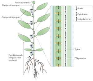 Strigolactones和cytokinin(细胞分裂素)在根尖分生组织中合成,经木质部(xylem)向茎尖运输,auxin(生长素)在茎尖分生组织中合成,由xylem parenchyma cells中的运输蛋白PIN1介导,从茎尖向根尖运输。