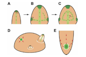 PIN1的极性分布,产生局部生长素浓度升高,形成新的原基。在新的原基中可以产生新的Wus-CLV1-STM途径,启动新的一轮分化过程。